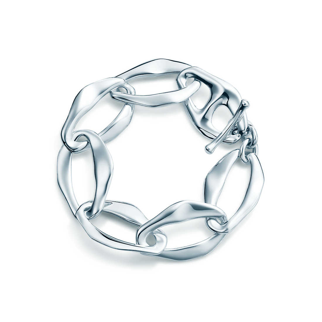 Each link has edges smoothed as though by the waves of a vast sea. Toggle bracelet in sterling silver. Size small, 8″ long. Original designs copyrighted by Elsa Peretti.