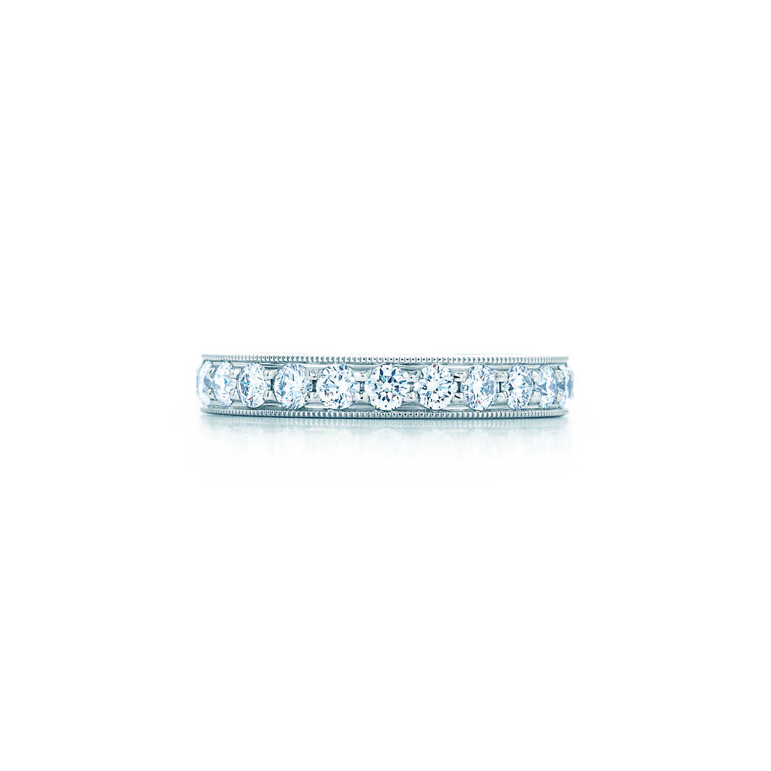 Evokes the glamour of the Edwardian period. Ring in platinum with a milgrain edge and a full circle of bead-set round brilliant diamonds. 3.2 mm wide. Carat total weight 1.21.