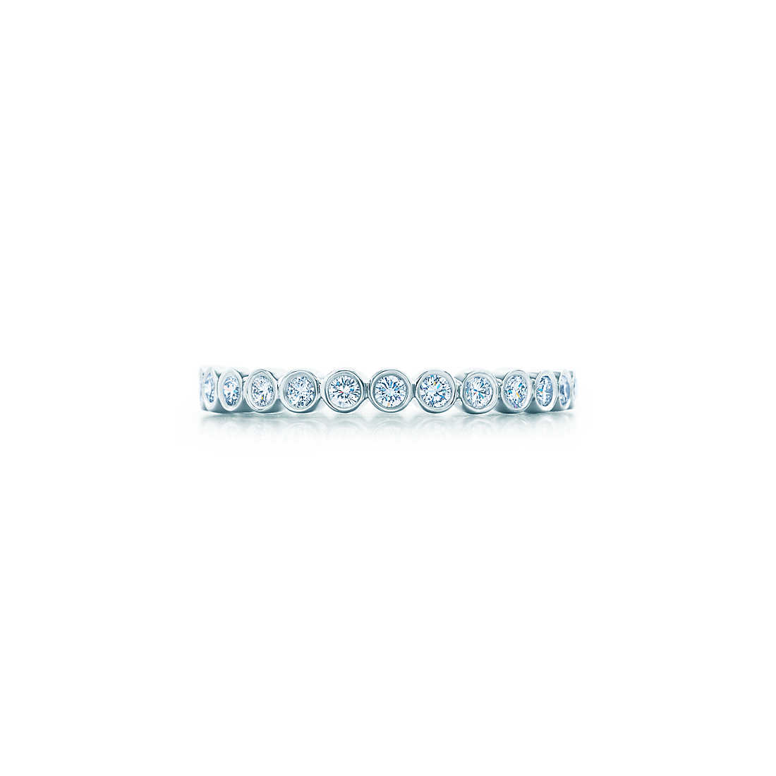 Bezel-set diamond band ring, full circle. Round brilliant diamonds, carat total weight .52 (size 7.5), color grade G, claritys grade VS2. Platinum.