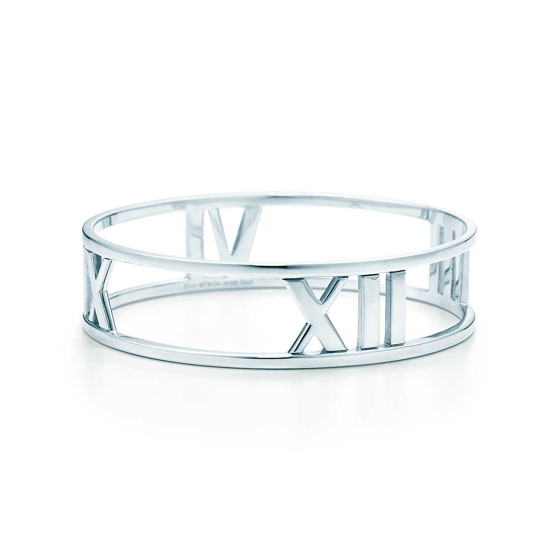 Strong lines meet striking numerals in a contemporary design that honours a Tiffany icon. Bangle in sterling silver. Small, fits wrists up to 5.75″ in circumference.