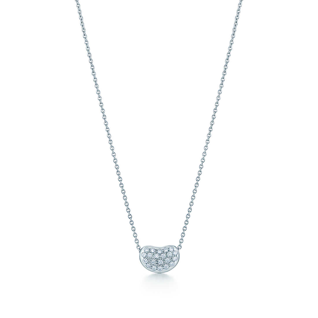 The bean represents the origin of all things. Pendant in platinum with pavé diamonds, 9 mm wide. On a 16″ chain. Carat total weight .12. Original designs copyrighted by Elsa Peretti.