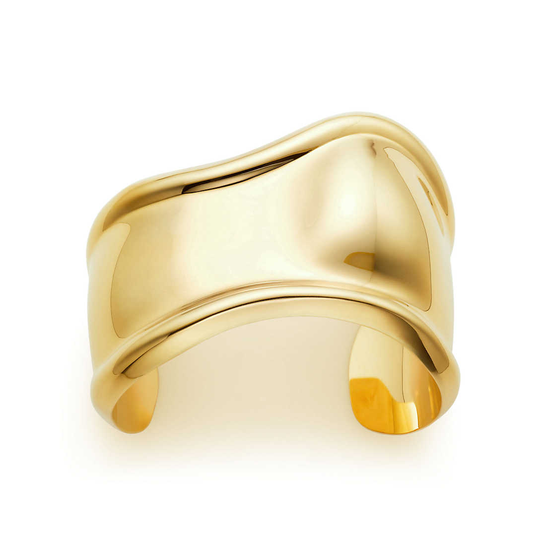 The sublime asymmetry and sensuous contours have an ergonomic quality that makes them one with the body. Cuff in 18k gold. Size medium, for the right wrist. Original designs copyrighted by Elsa Peretti.