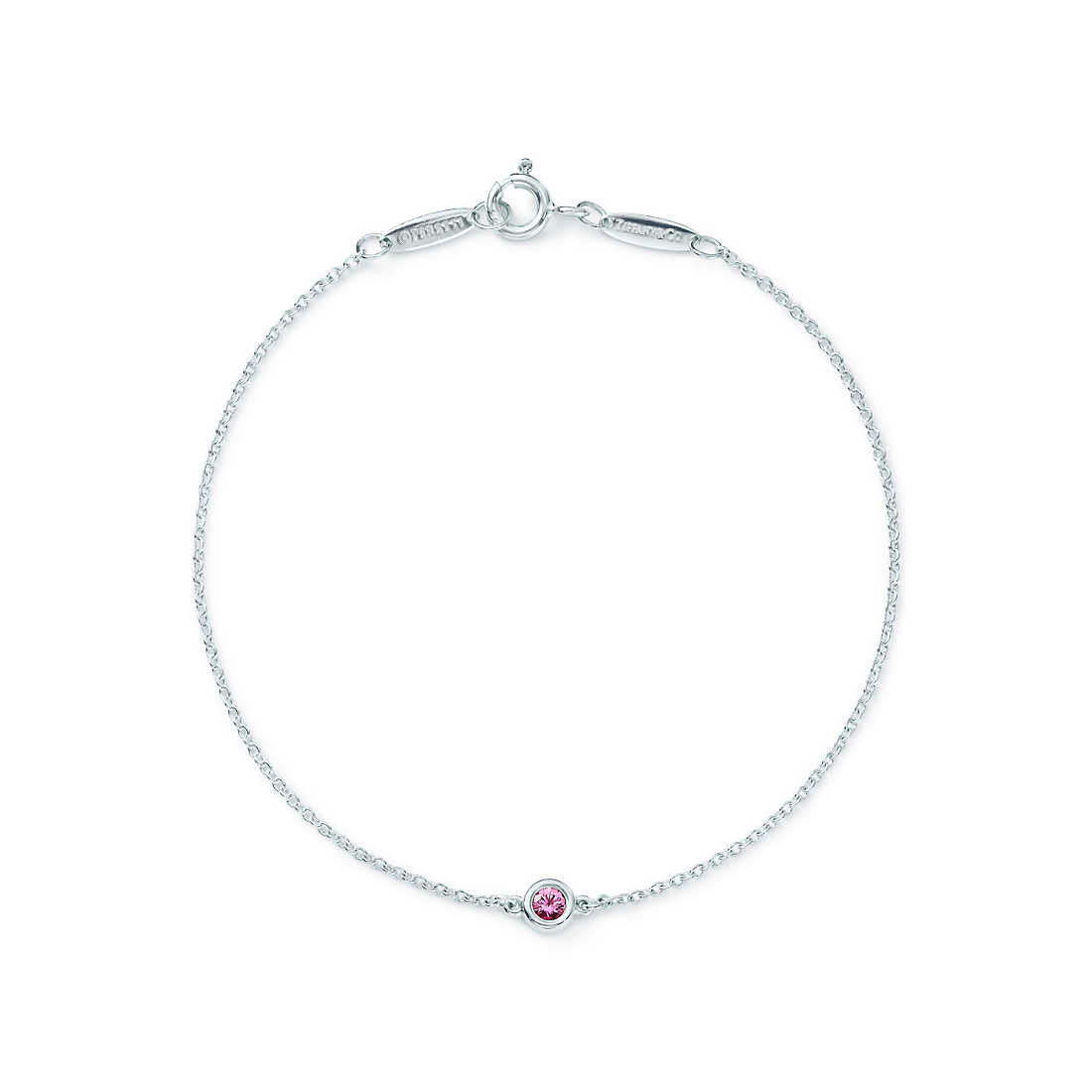 Bracelet in sterling silver with a round pink sapphire. 7″ long. Carat total weight .08. Original designs copyrighted by Elsa Peretti.