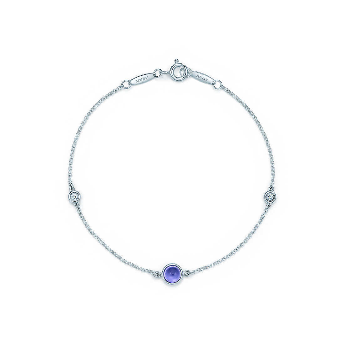Bracelet in sterling silver with a cabochon tanzanite and two round brilliant diamonds. 7.25″ long. Diamonds, carat total weight .06. Original designs copyrighted by Elsa Peretti.
