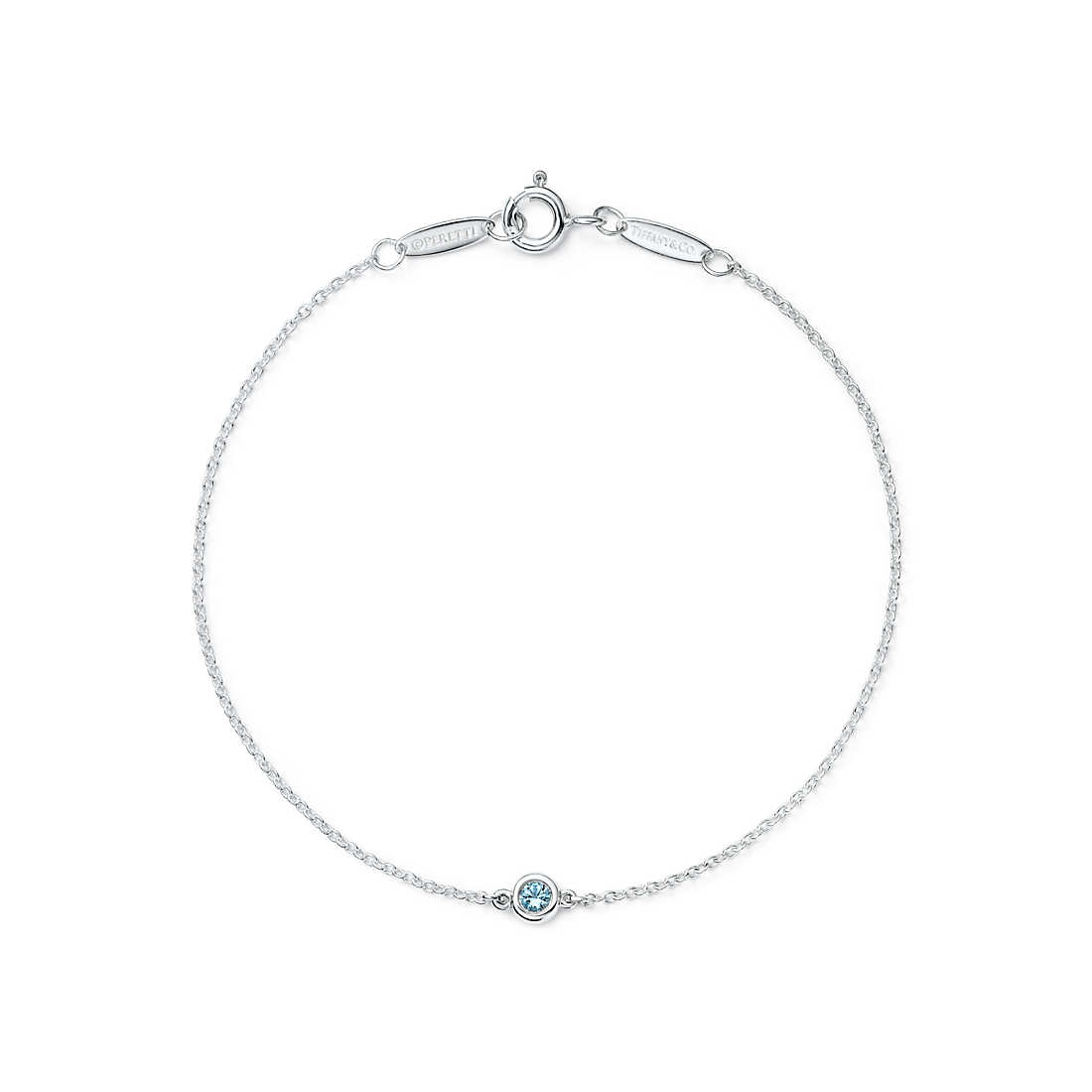 Bracelet in sterling silver with a round aquamarine. 7″ long. Carat weight .06. Original designs copyrighted by Elsa Peretti.