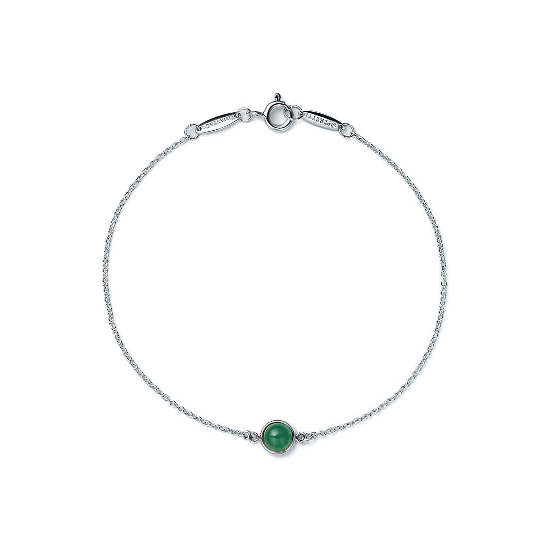 Bracelet in sterling silver with a green aventurine cabochon. 7″ long. Original designs copyrighted by Elsa Peretti.