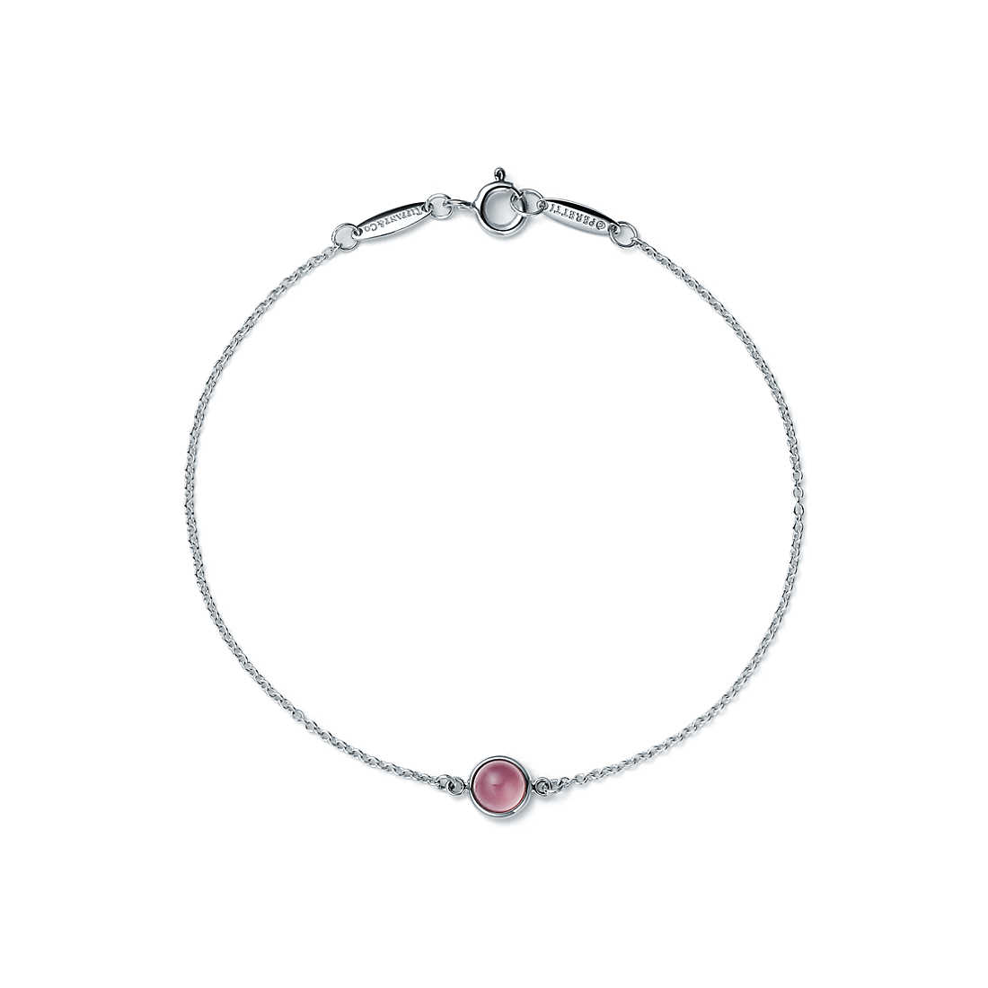 Bracelet in sterling silver with a purple chalcedony cabochon. 7″ long. Original designs copyrighted by Elsa Peretti.