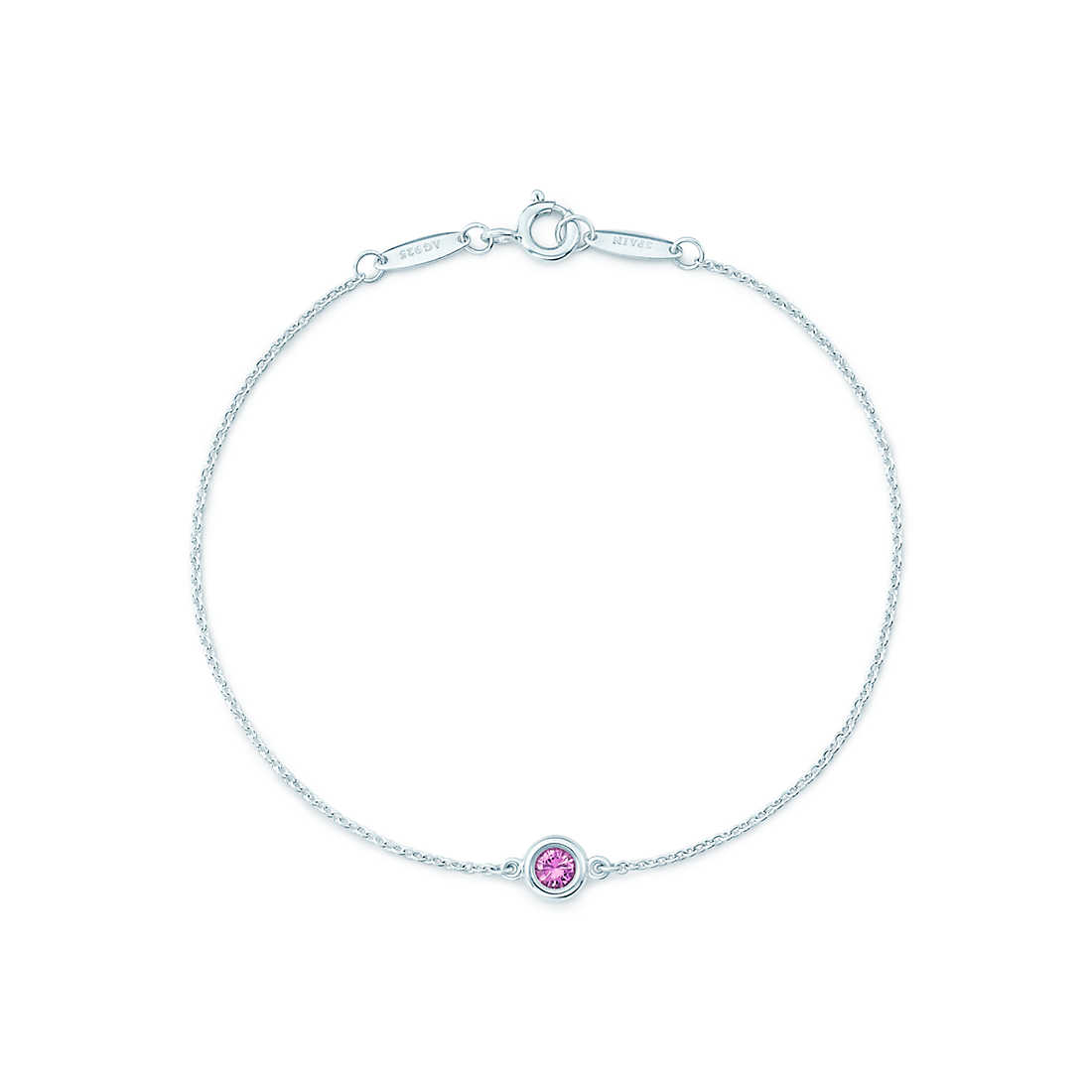 Bracelet in sterling silver with a round pink sapphire. 7.25″ long. Carat weight .18. Original designs copyrighted by Elsa Peretti.