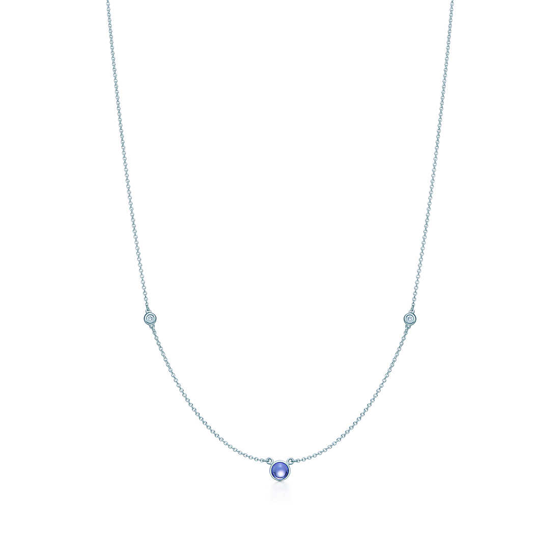 Necklace in sterling silver with a cabochon tanzanite and round brilliant diamonds. 16″ long. Diamonds, carat total weight .06. Original designs copyrighted by Elsa Peretti.