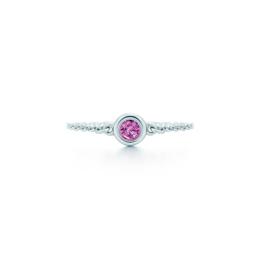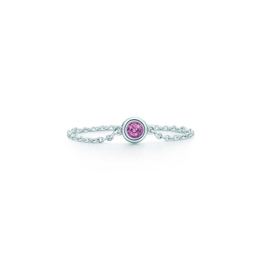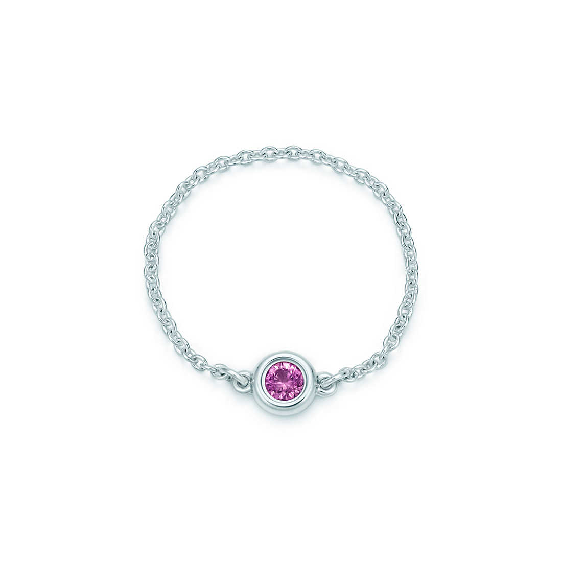 Ring in sterling silver with a round pink sapphire. Carat weight .08. Original designs copyrighted by Elsa Peretti.