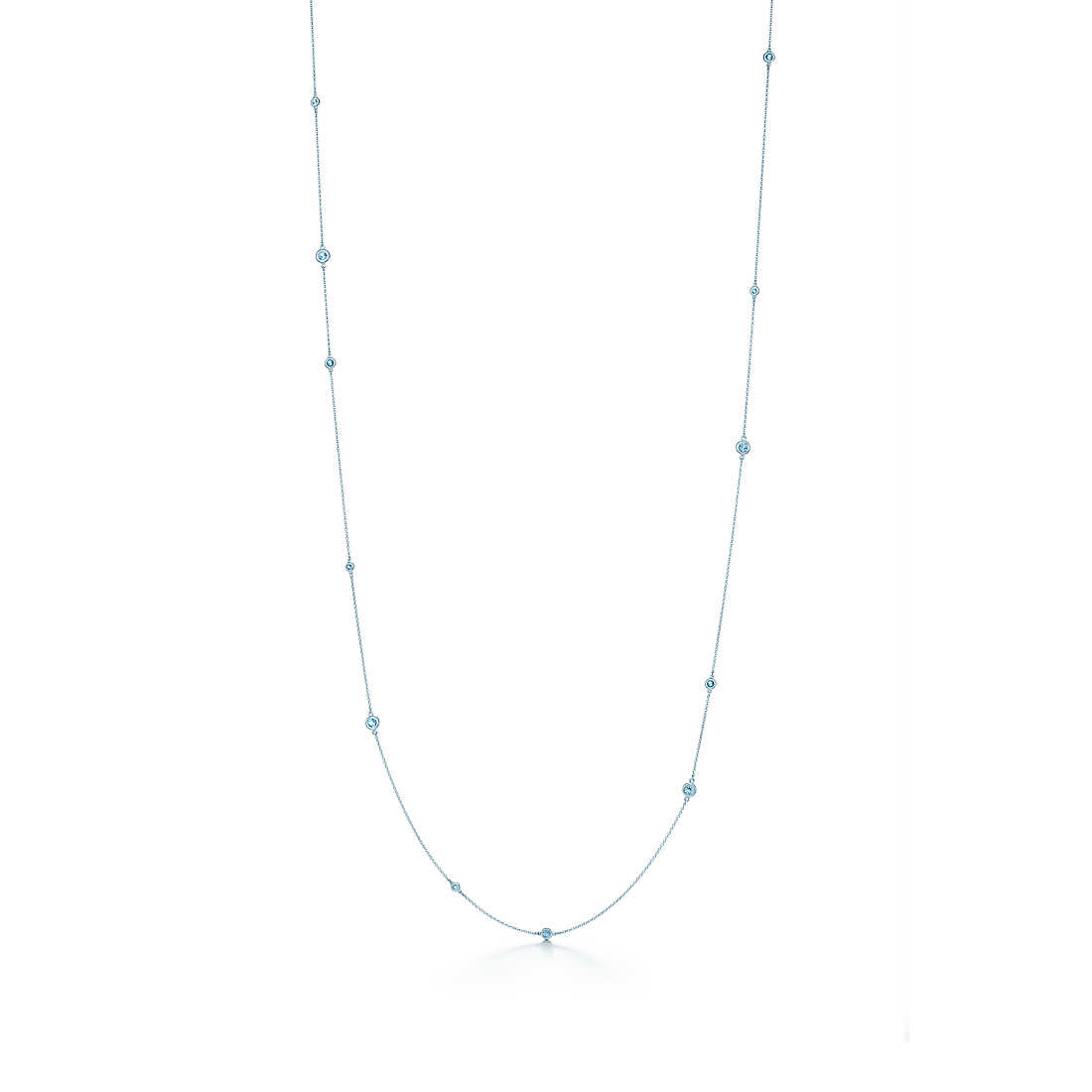 Necklace in sterling silver with 12 round aquamarines. 36″ long. Carat total weight .95. Original designs copyrighted by Elsa Peretti.