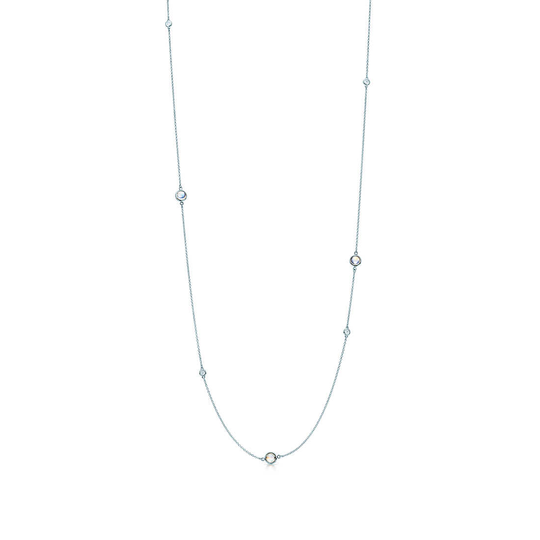 Sprinkle necklace in sterling silver with three cabochon rainbow moonstones and four round brilliant diamonds. 30″ long. Carat total weight .12. Original designs copyrighted by Elsa Peretti.