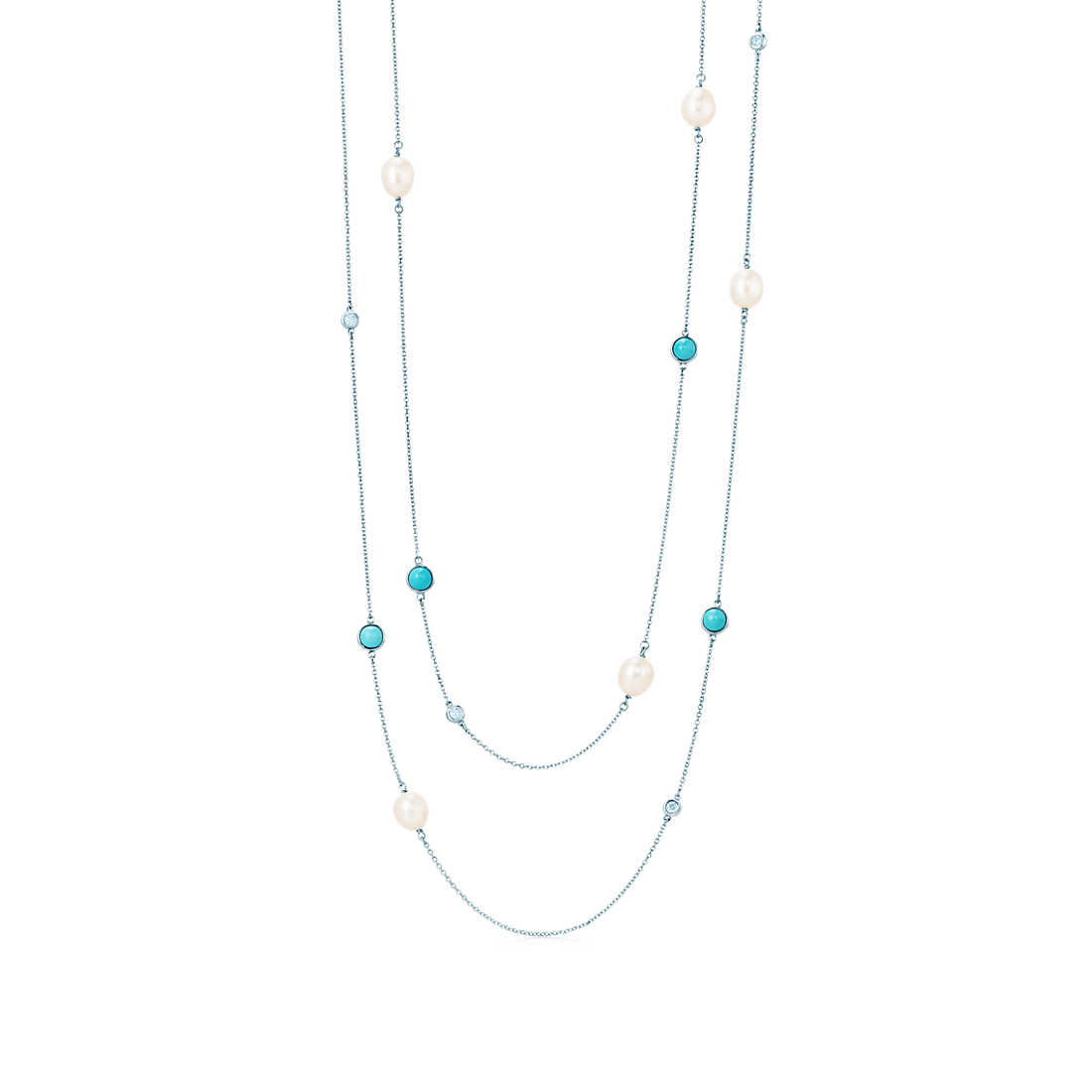 Sprinkle necklace in sterling silver with four turquoise cabochons, five freshwater cultured pearls and four round brilliant diamonds. 36″ long. Carat total weight .20. Original designs copyrighted by Elsa Peretti.