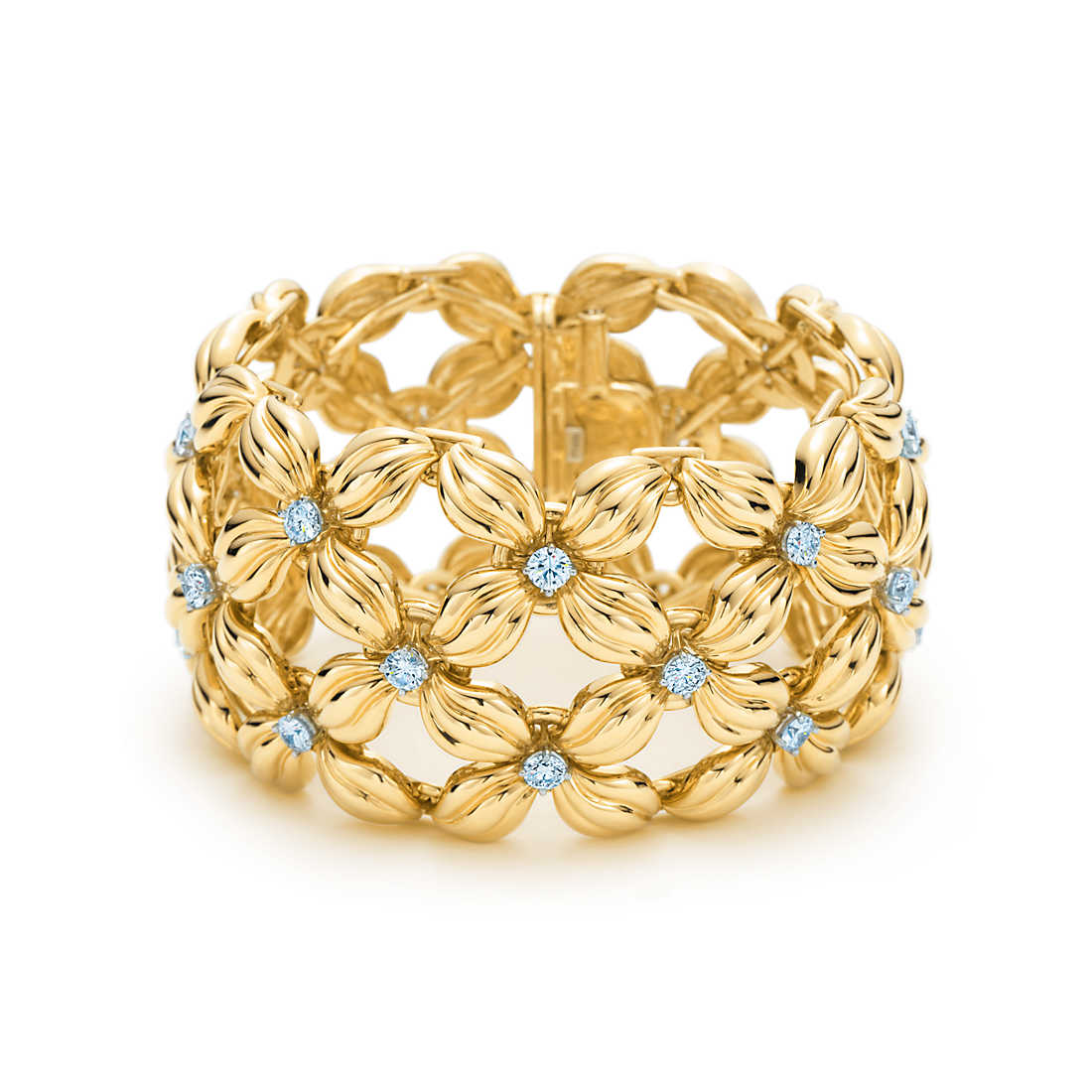 Schlumberger’s imaginative interpretation of the familiar flower. Bracelet in 18k gold with round brilliant diamonds in platinum. 7″ long. Carat total weight 4.08.