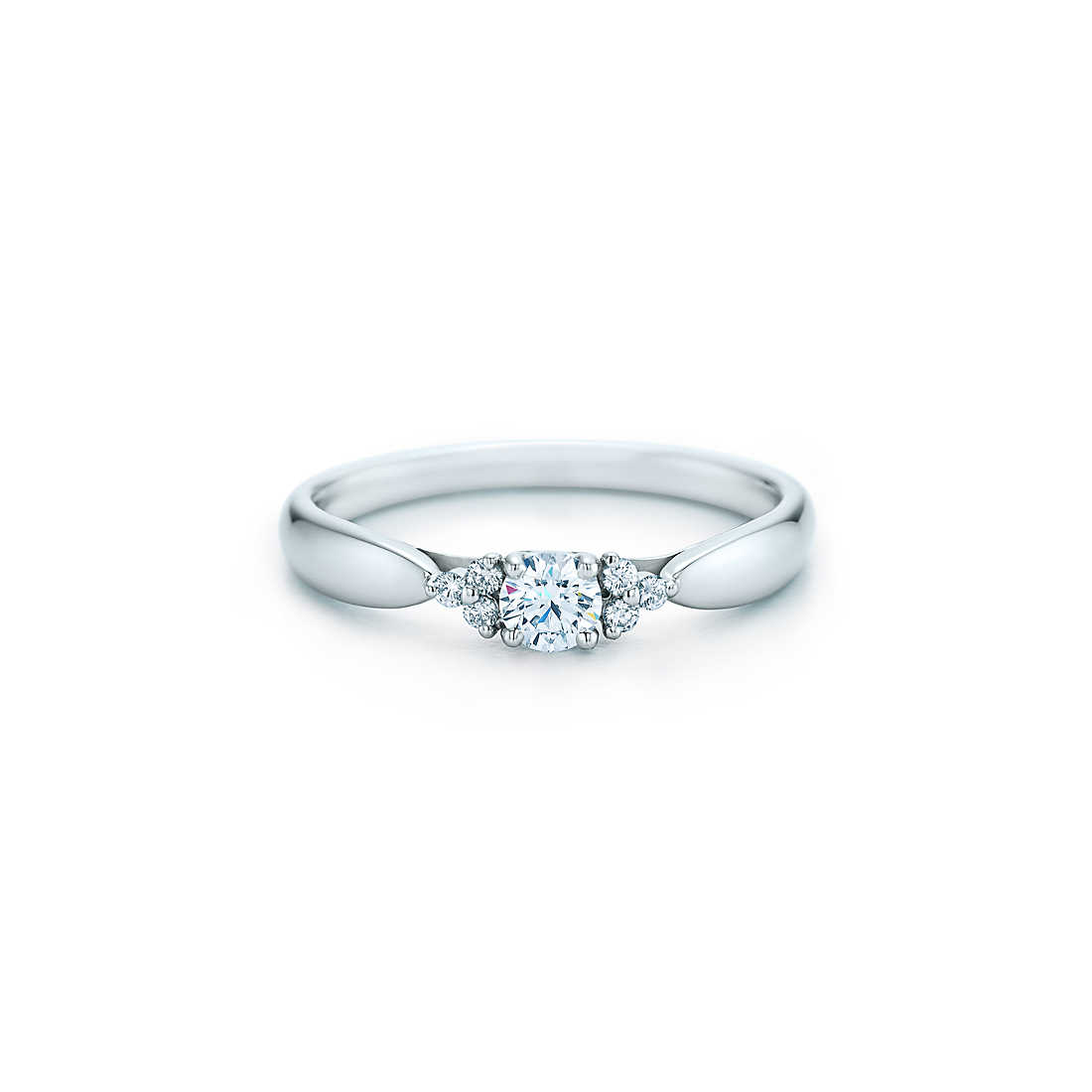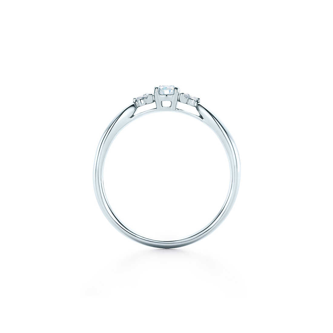 Round brilliant diamonds are delicately cradled in a tapered platinum band. Carat total weight .19.