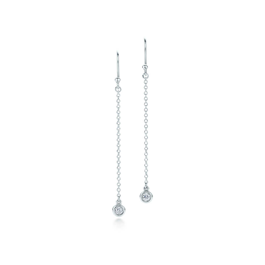 Tiffany round diamonds catch the light and make it dance. Drop earrings in sterling silver with two round brilliant diamonds. Carat total weight .10. Original designs copyrighted by Elsa Peretti.