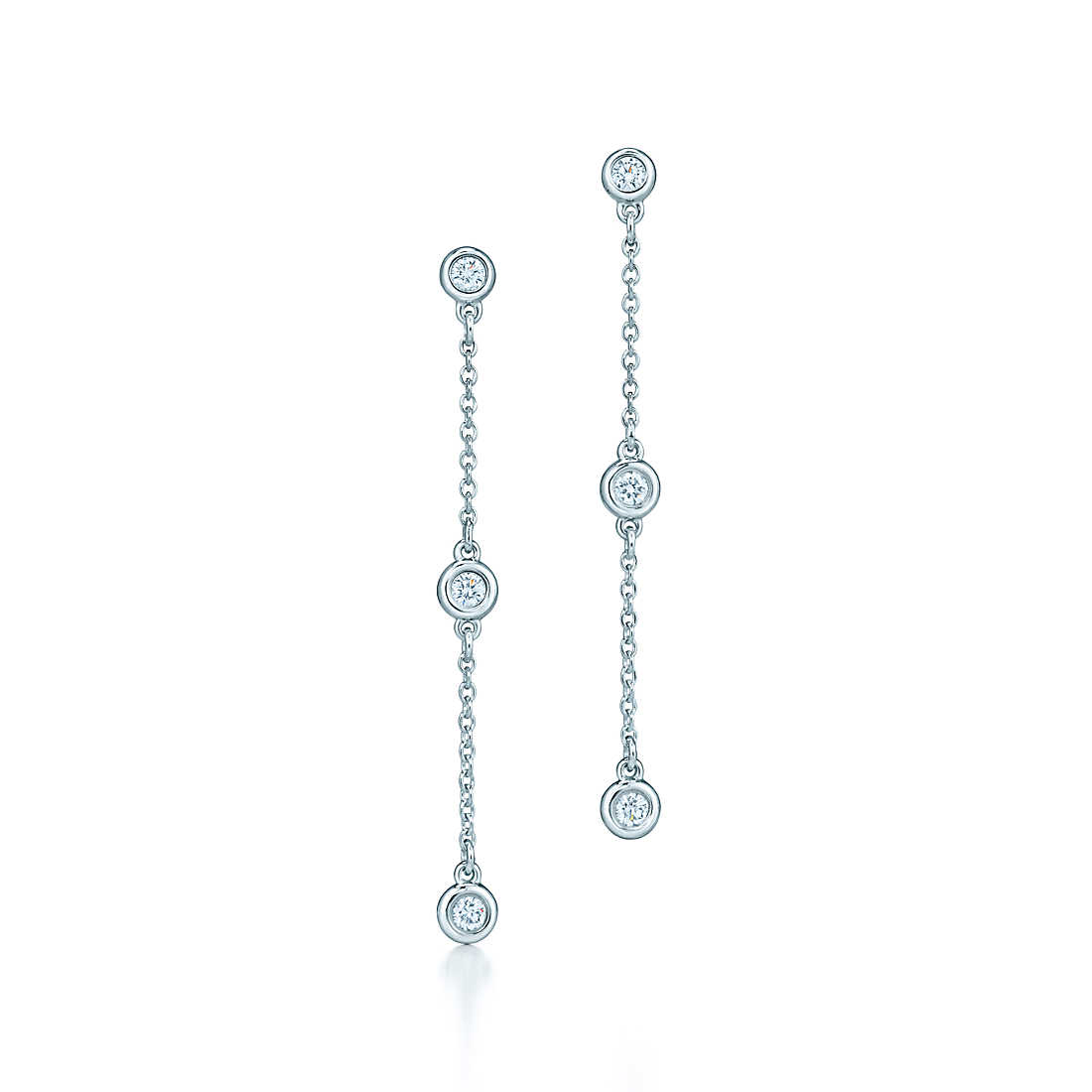 Tiffany round diamonds catch the light and make it dance. Drop earrings in sterling silver with six round brilliant diamonds. Carat total weight .18. Original designs copyrighted by Elsa Peretti.