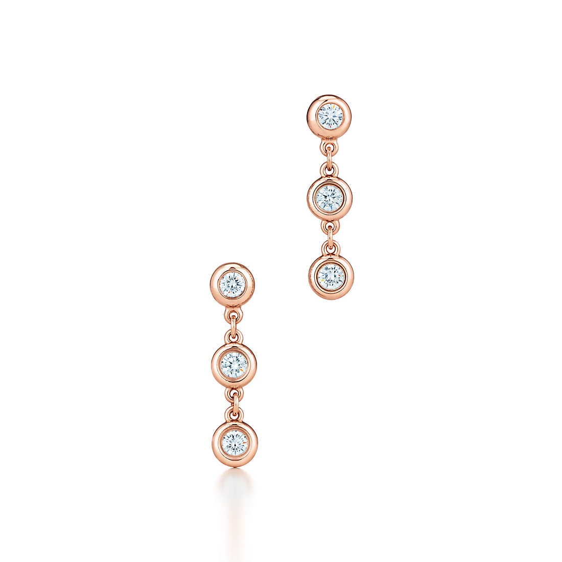 Tiffany round diamonds catch the light and make it dance. Drop earrings in 18k rose gold with six round brilliant diamonds. Carat total weight .28. Original designs copyrighted by Elsa Peretti.