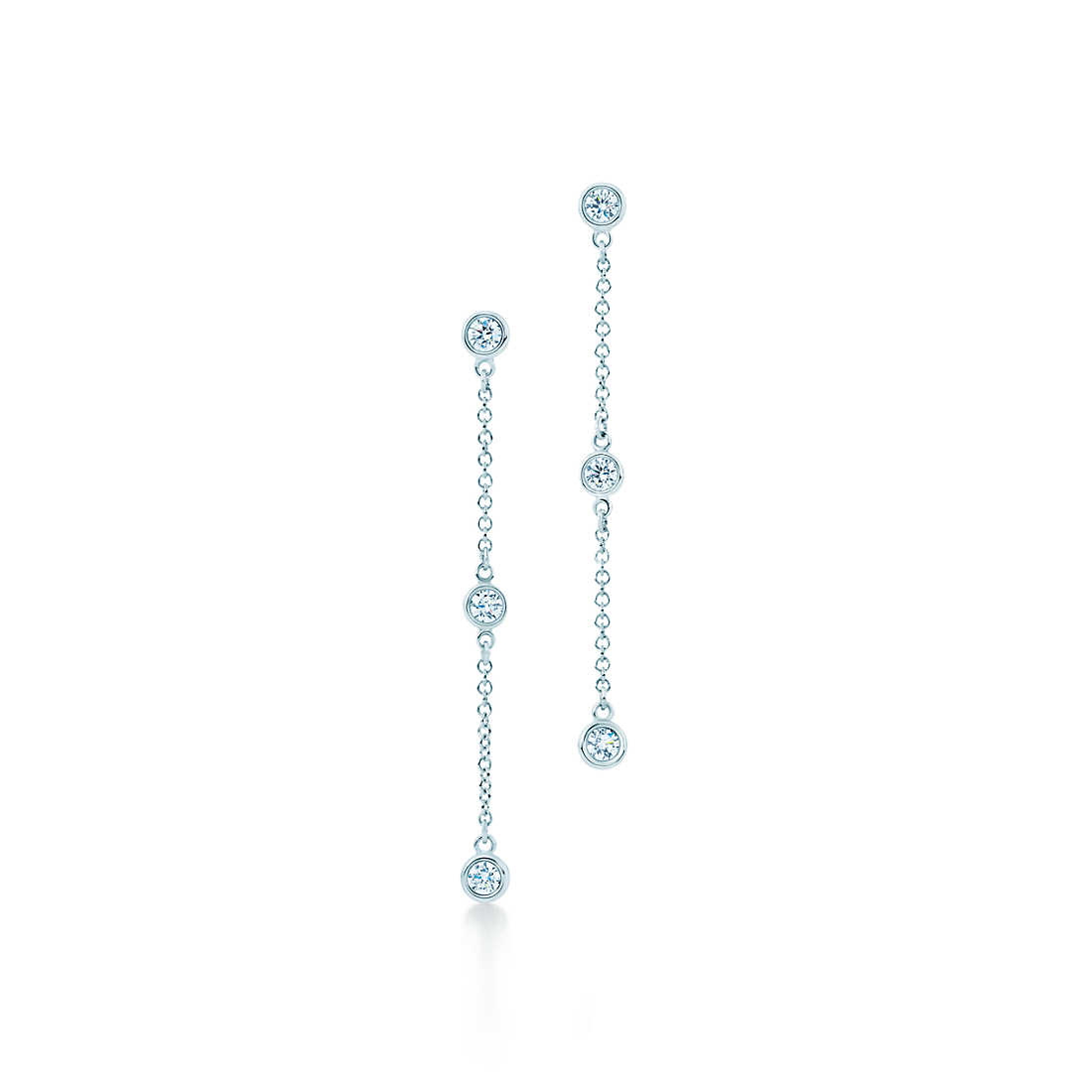 Tiffany round diamonds catch the light and make it dance. Earrings in platinum with six round brilliant diamonds. Carat total weight .30. Original designs copyrighted by Elsa Peretti.
