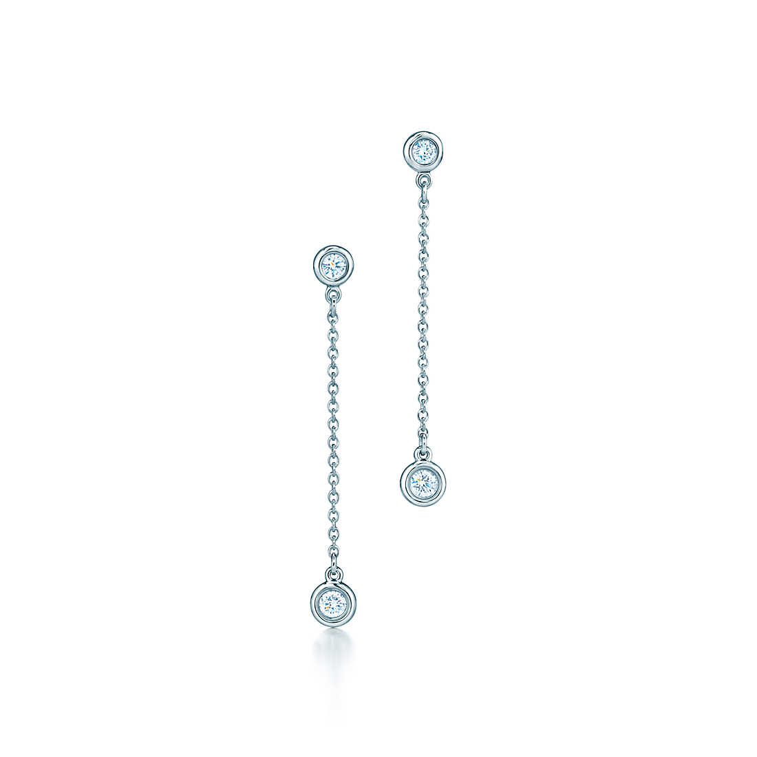 Tiffany round diamonds catch the light and make it dance. Drop earrings in sterling silver with four round brilliant diamonds. Carat total weight .24. Original designs copyrighted by Elsa Peretti.