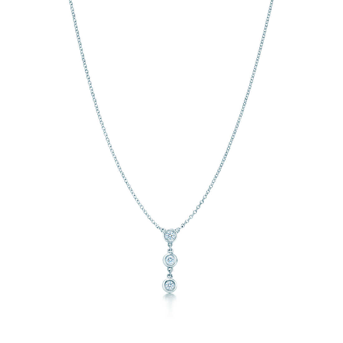 Tiffany round diamonds catch the light and make it dance. Drop pendant in sterling silver with three round brilliant diamonds. 16″ long. Carat total weight .15. Original designs copyrighted by Elsa Peretti.