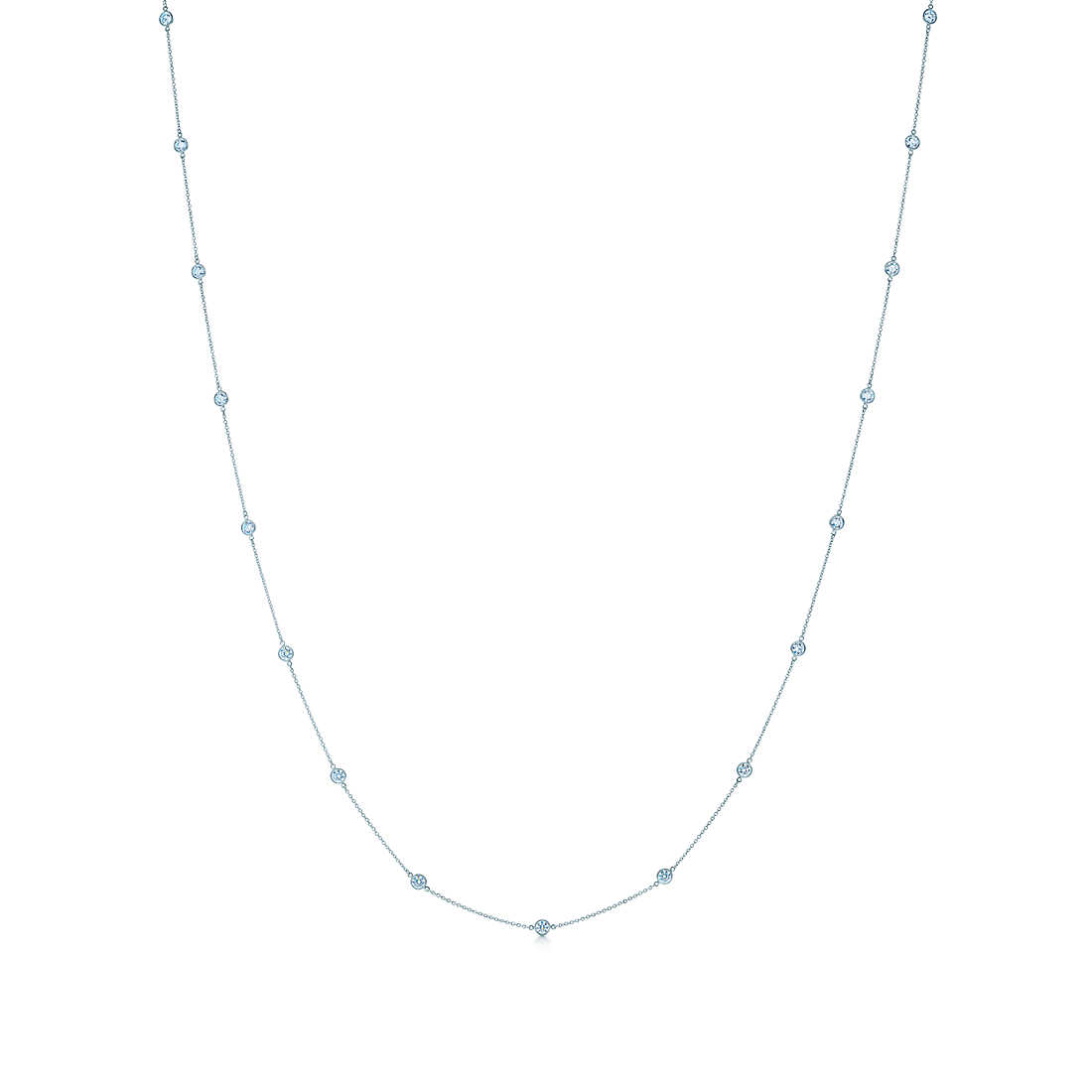 Tiffany round diamonds catch the light and make it dance. Necklace in platinum with 24 round brilliant diamonds. 38″ long. Carat total weight 4.32. Original designs copyrighted by Elsa Peretti.