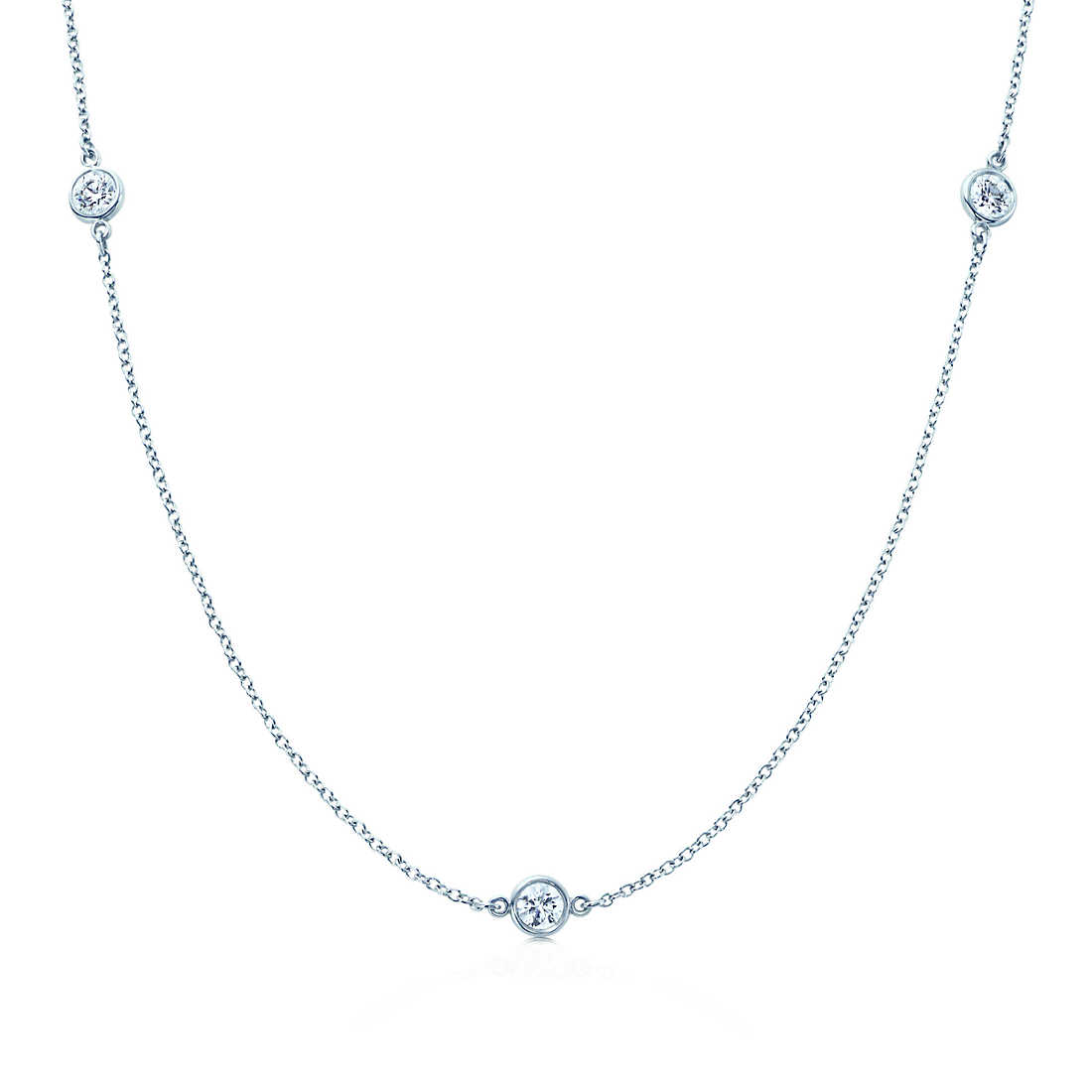Tiffany round diamonds catch the light and make it dance. Necklace in platinum with three round brilliant diamonds. 16″ long. Carat total weight .15. Original designs copyrighted by Elsa Peretti.