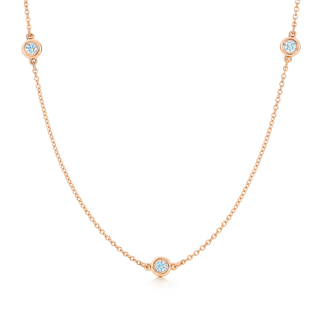 Tiffany round diamonds catch the light and make it dance. Necklace in 18k rose gold with three round brilliant diamonds. 16″ long. Carat total weight .21. Original designs copyrighted by Elsa Peretti.