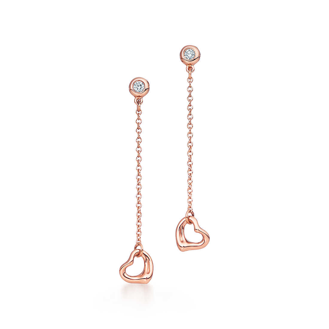 Tiffany round diamonds catch the light and make it dance. Drop earrings in 18k rose gold with two round brilliant diamonds. 1.5″ long. Open Hearts, 7 mm. Carat total weight .06. Original designs copyrighted by Elsa Peretti.