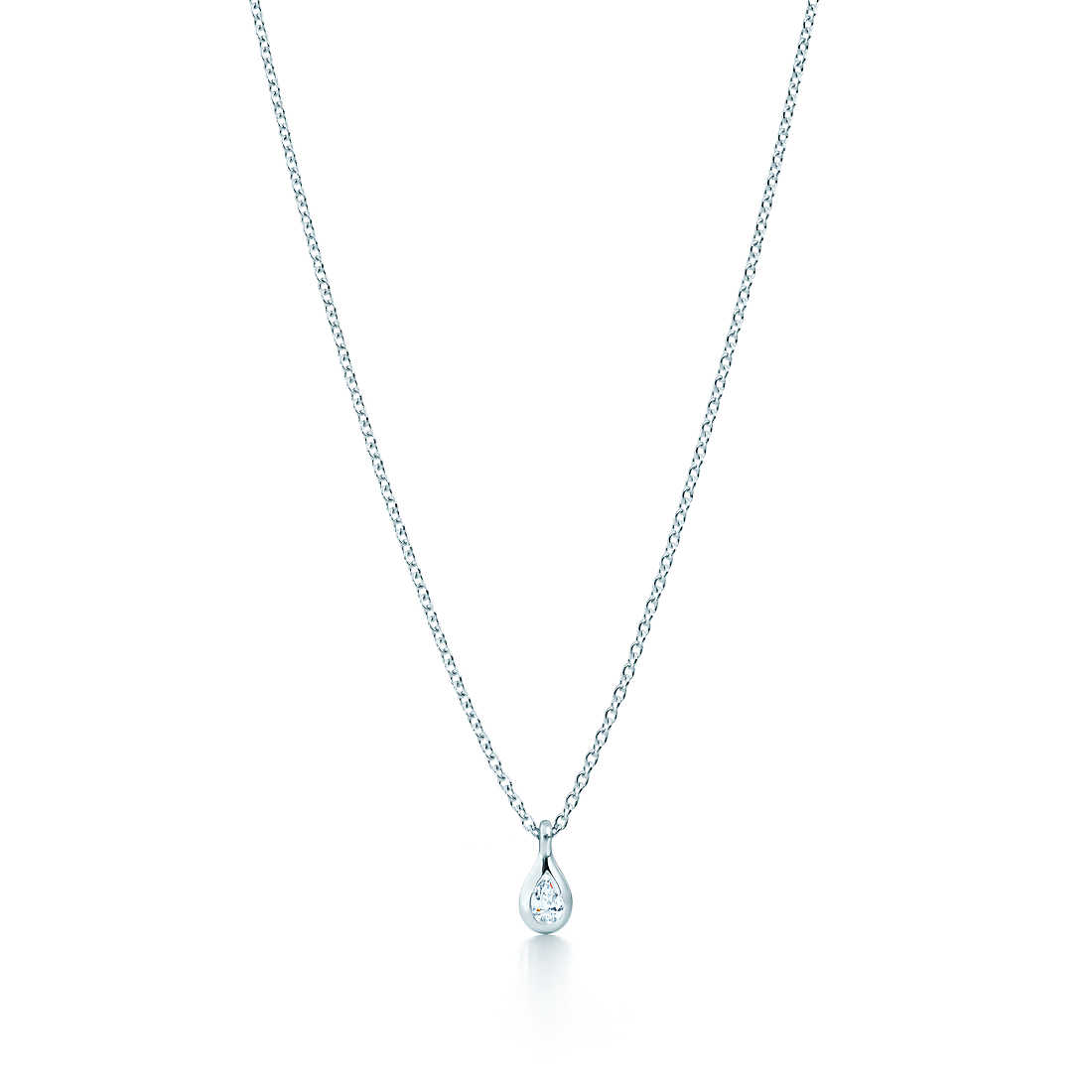 Tiffany round diamonds catch the light and make it dance. Pendant in sterling silver with a pear-shaped diamond. On a 16″ chain. Carat weight .07. Original designs copyrighted by Elsa Peretti.