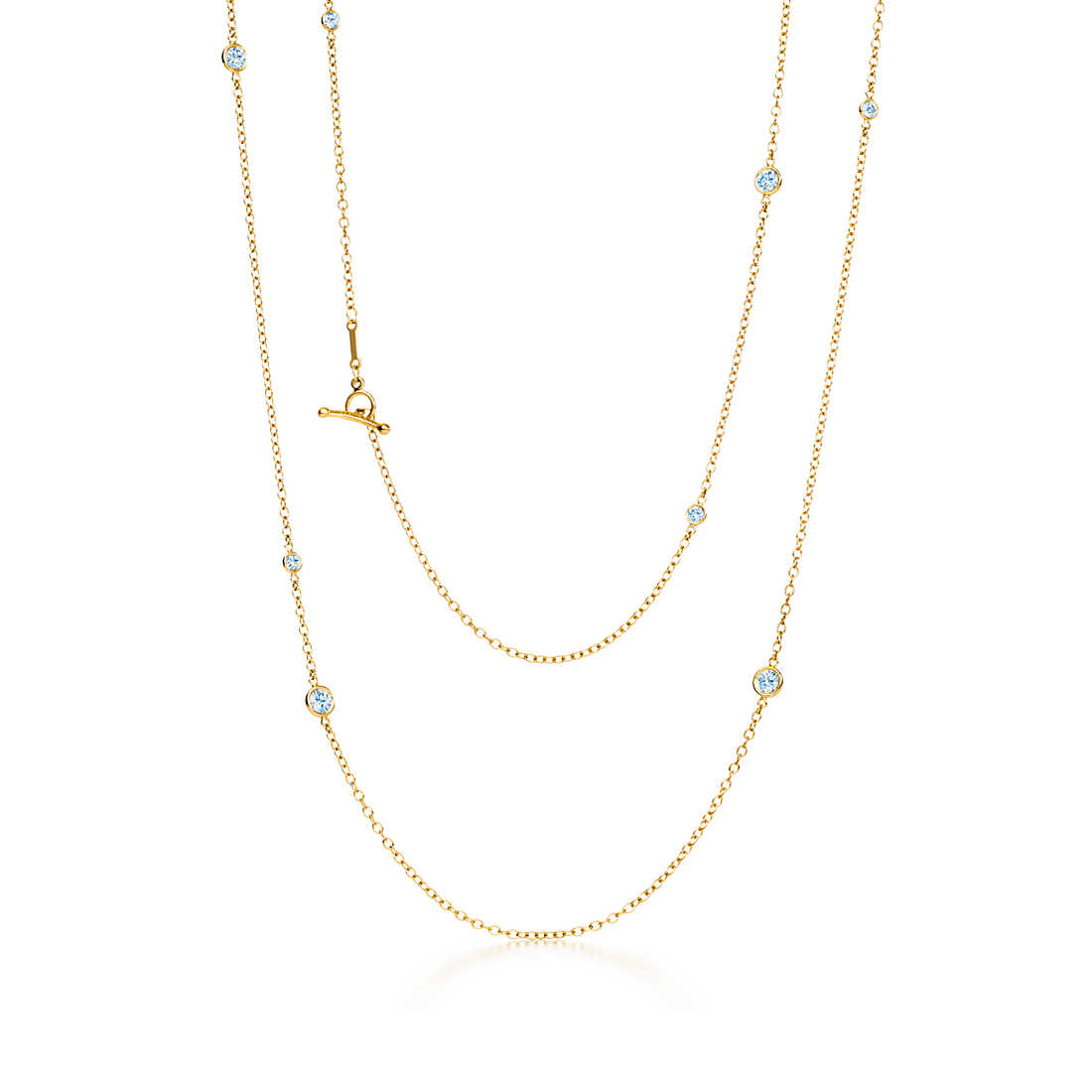 Tiffany round diamonds catch the light and make it dance. Sprinkle necklace in 18k gold with 12 round brilliant diamonds. 36″ long. Carat total weight 1.21. Original designs copyrighted by Elsa Peretti.