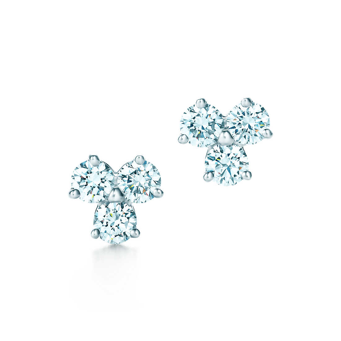 A triad of brilliant diamonds set in perfect harmony. Earrings of round brilliant diamonds in platinum, for pierced ears.
