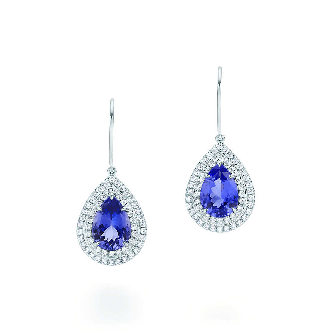 Earrings in platinum with pear-shaped tanzanites and round brilliant diamonds. Tanzanites, carat total weight 2.50. Diamonds, carat total weight .51.