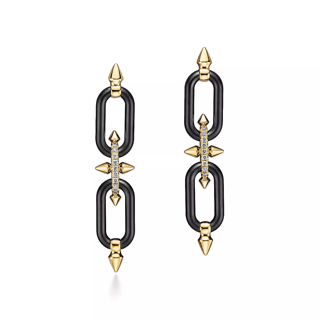 Building on the House’s legacy of collaborating with visionary artists, Tiffany Titan by Pharrell Williams is an expression of rebellion as a catalyst for creativity. These designs draw inspiration from Poseidon and his trident. An angular spear-shaped motif and bold contoured links are crafted from 18k gold and titanium for a striking contrast. Fishtail-set pavé diamonds allow light to enter from every angle, maximizing brilliance.