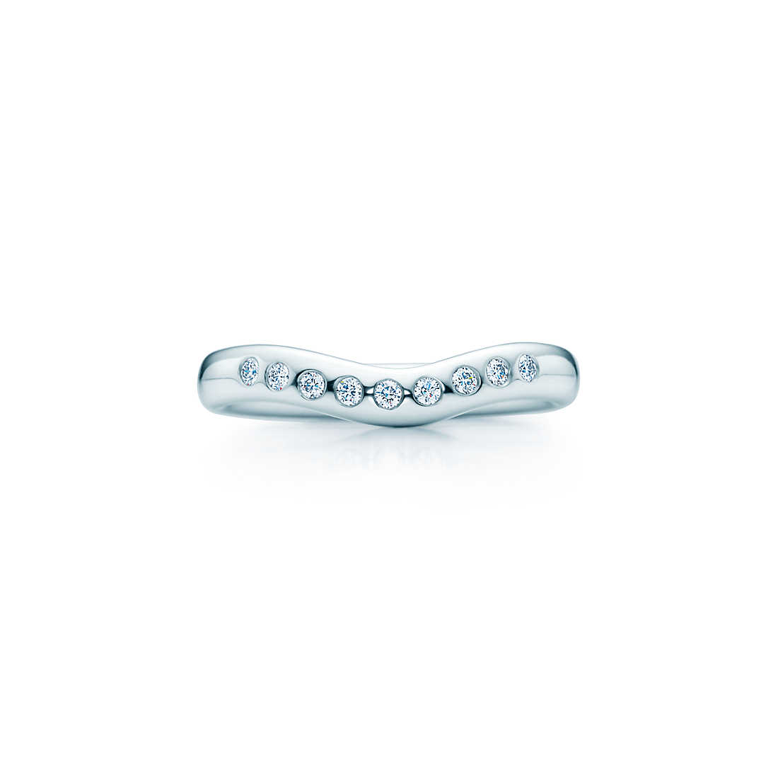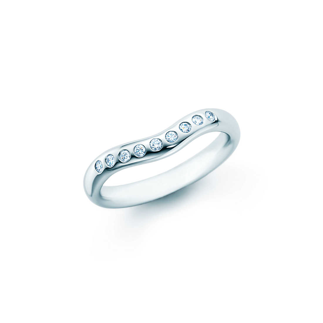 Round brilliant diamonds add sparkle to Peretti’s sculptural design. Band ring with diamonds in platinum. Size wide. Original designs copyrighted by Elsa Peretti.