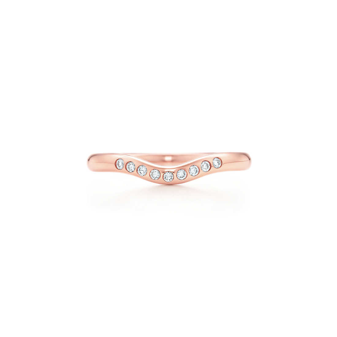 Round brilliant diamonds add sparkle to Peretti’s sculptural design. Ring in 18k rose gold with nine round brilliant diamonds. 2 mm wide. Carat total weight .06. Original designs copyrighted by Elsa Peretti.