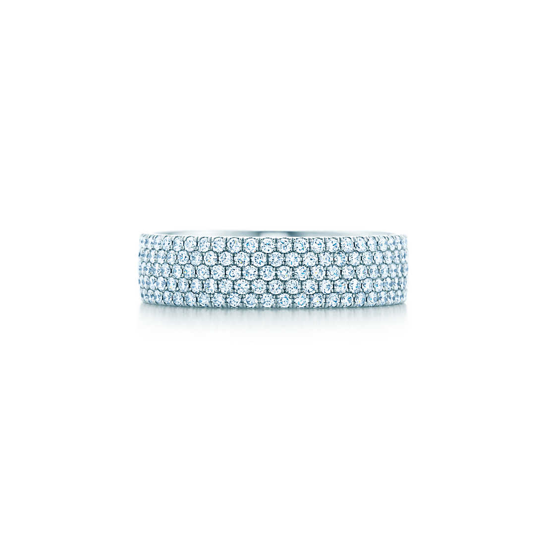 Streamlined and modern, the Tiffany Metro collectsion twinkles like a nighttime city skyline. Five rows of dazzling diamonds make this ring a stunning statement piece.