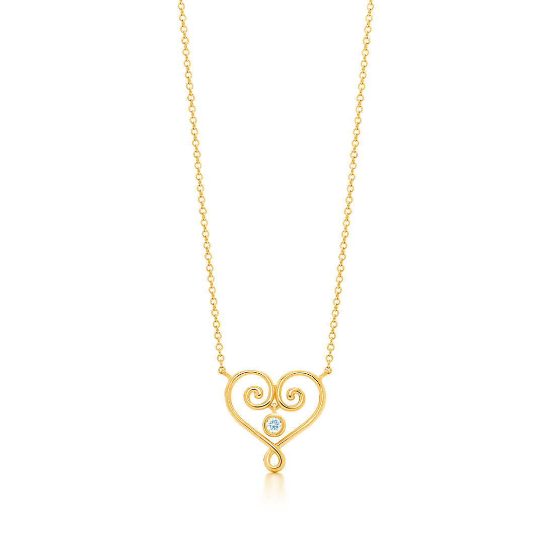 These intricate designs recall Venetian cast-iron window gates. Pendant in 18k gold with a round brilliant diamond. Size extra small, on a 16″ chain. Carat total weight .03. Original designs copyrighted by Paloma Picasso.