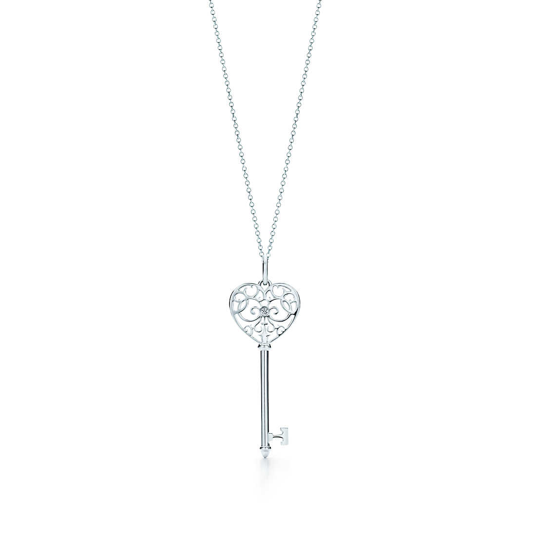 In 18k white gold with a round brilliant diamond. 1.5″ long. Key and chain sold separately.