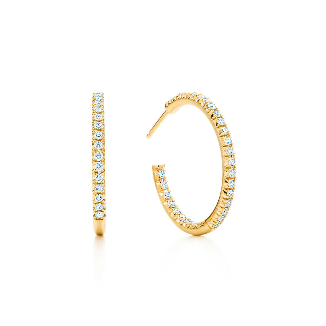 Streamlined and modern, the Tiffany Metro collectsion twinkles like a nighttime city skyline. Dazzling diamonds trace the classic shape of these hoop earrings.