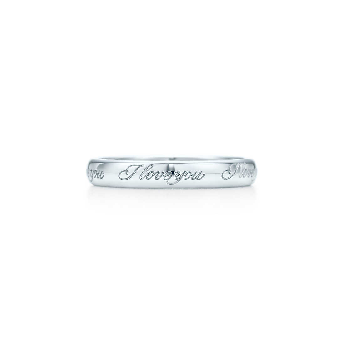 An elegant script, inspired by handwritten invitations. Band ring in platinum. 3 mm wide.