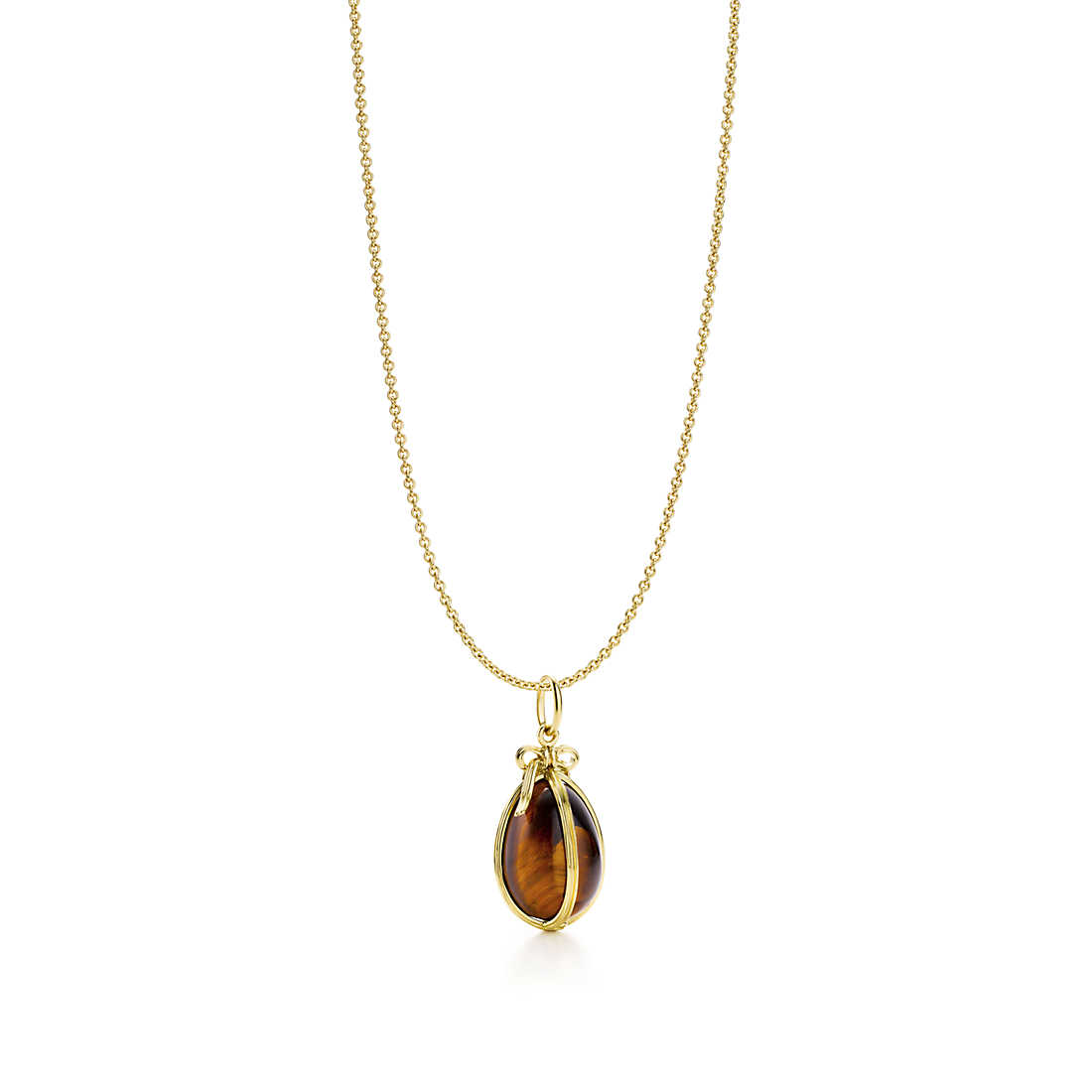 Inspired by a collectsion of egg pendants designed by Jean Schlumberger in the 1960s. Charm with tiger’s eye in 18k gold. Size small, on an 18″ Schlumberger chain. Charm and chain available separately.