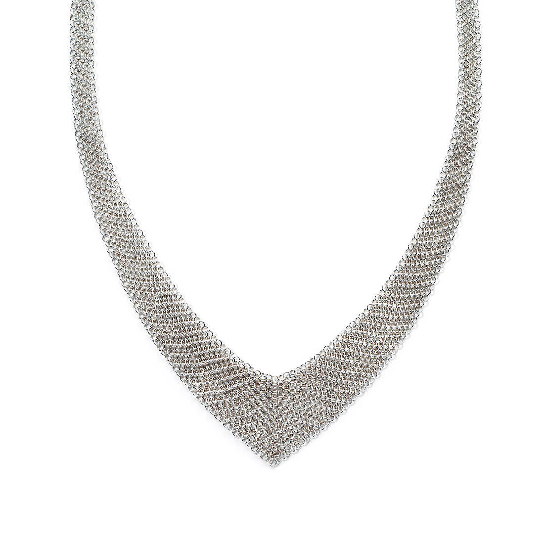The form is malleable and ergonomic in the way it drapes over the body’s contours. Bib necklace in sterling silver. Size mini, 26″ long. Ties to variable lengths. Original designs copyrighted by Elsa Peretti.