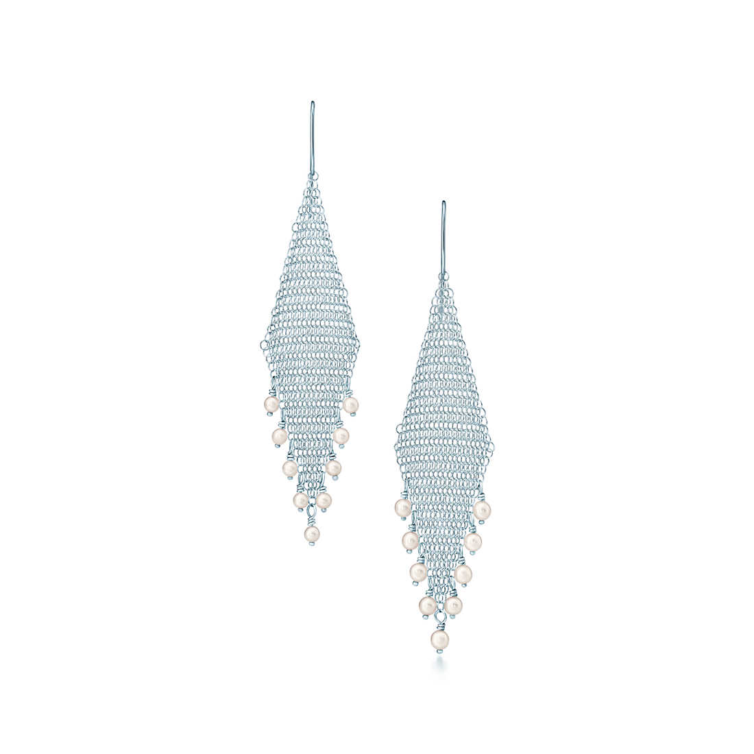 The form is malleable and ergonomic in the way it drapes over the body’s contours. Fringe earrings in sterling silver with freshwater cultured pearls. 2.75″ long. Pearls, 2.5-3mm. Original designs copyrighted by Elsa Peretti.