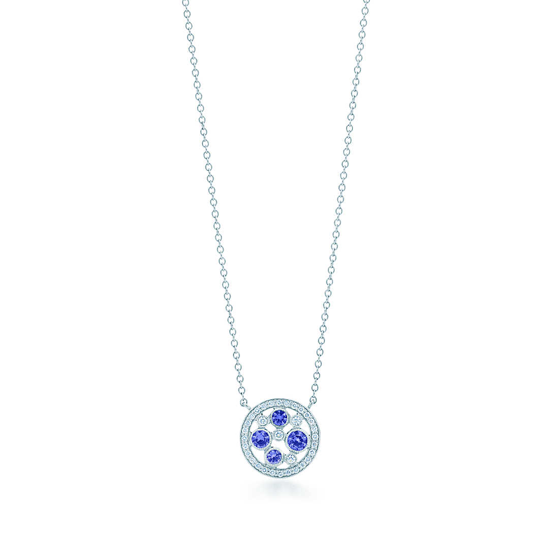 Diamonds and sapphires in a variety of sizes are snugly set together in a precious path of dazzling cobblestones. Pendant in platinum with Montana sapphires and diamonds. On a 16″ chain. Round sapphires, carat total weight .25; round brilliant diamonds, carat total weight .08.
