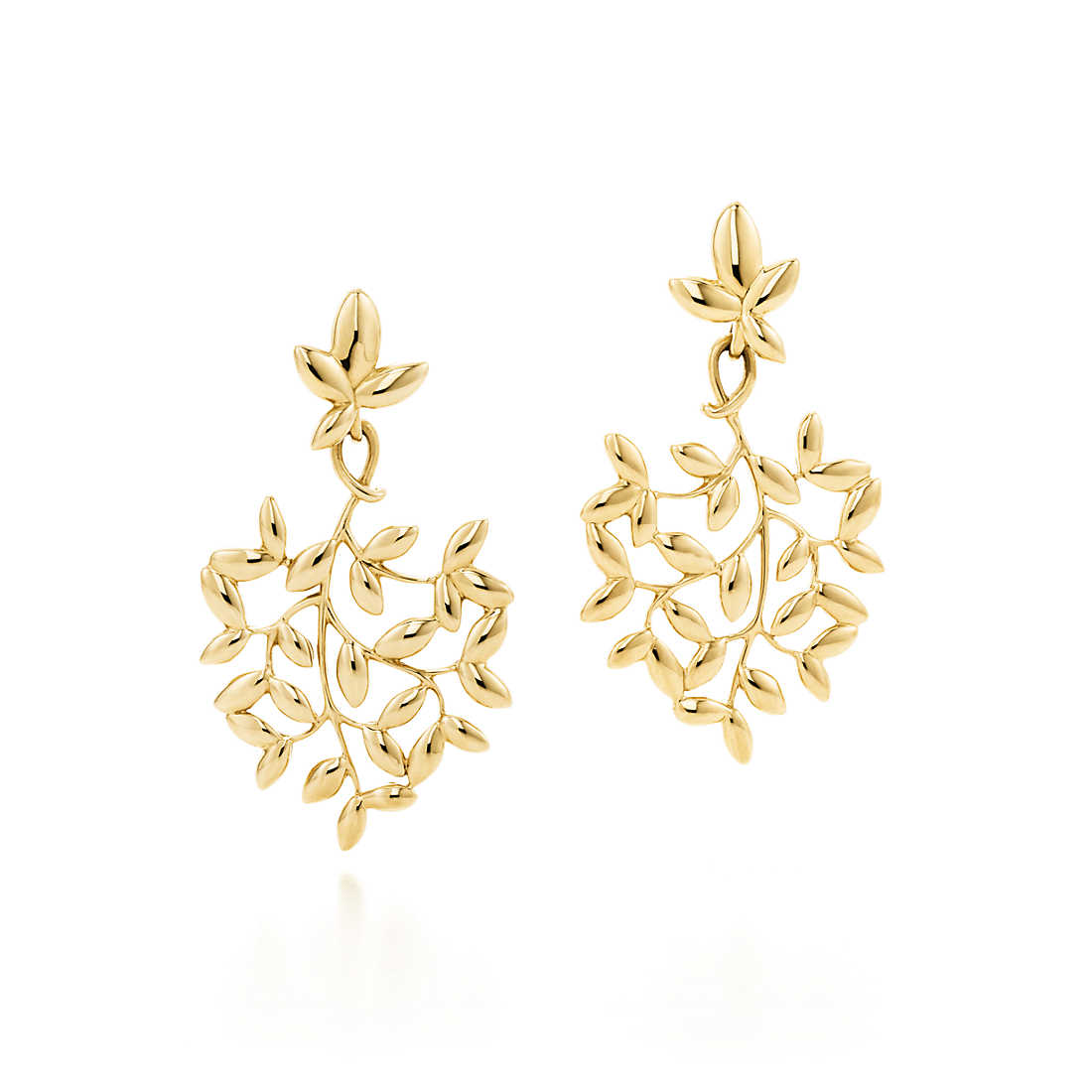 A beautiful tribute to the olive branch, a symbol of peace and abundance. Drop earrings in 18k gold, for pierced ears. Size small. Original designs copyrighted by Paloma Picasso.