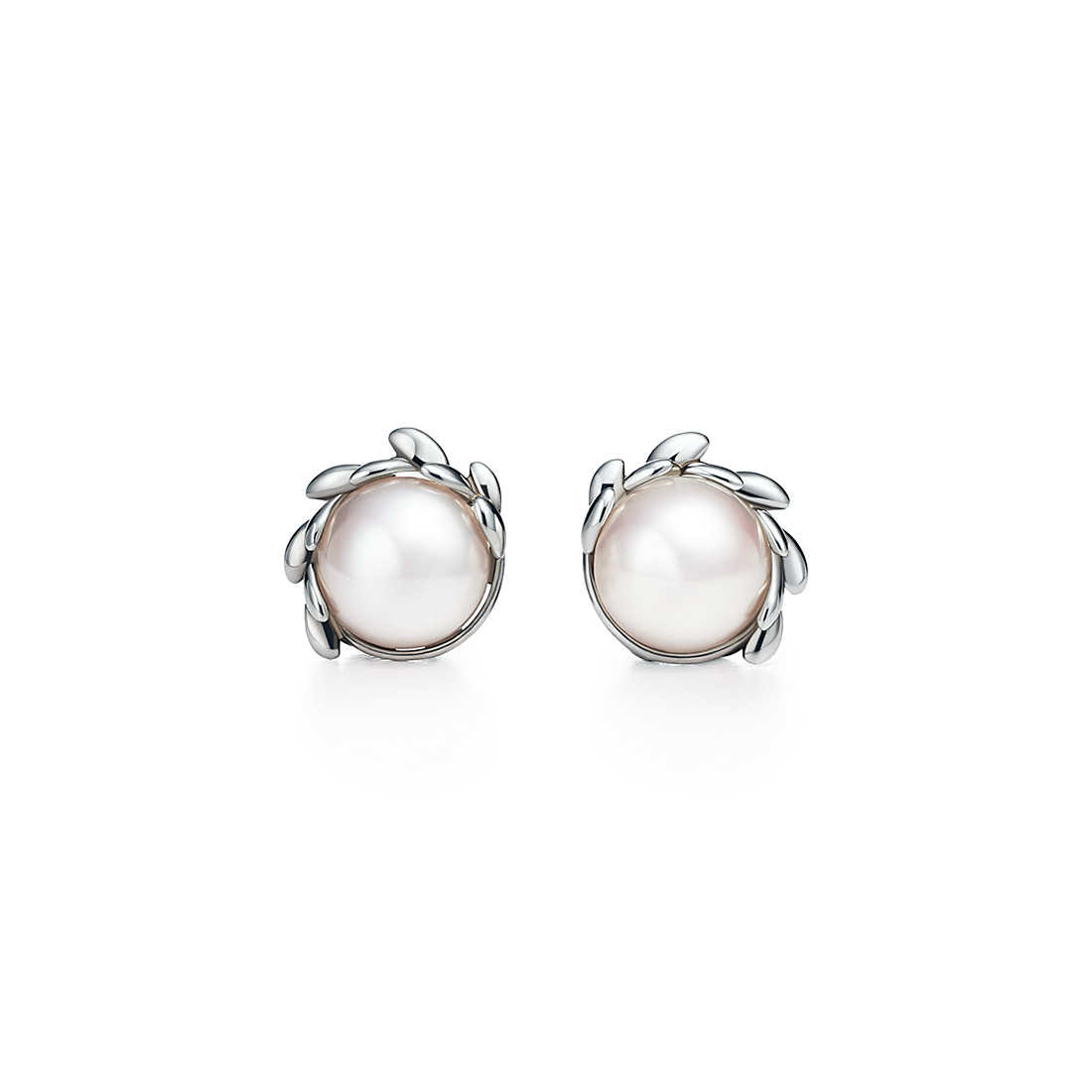 A beautiful tribute to the olive branch, a symbol of peace and abundance. Earrings in sterling silver with freshwater cultured pearls. Pearls, 9-9.5 x 6.5-7 mm. Original designs copyrighted by Paloma Picasso.