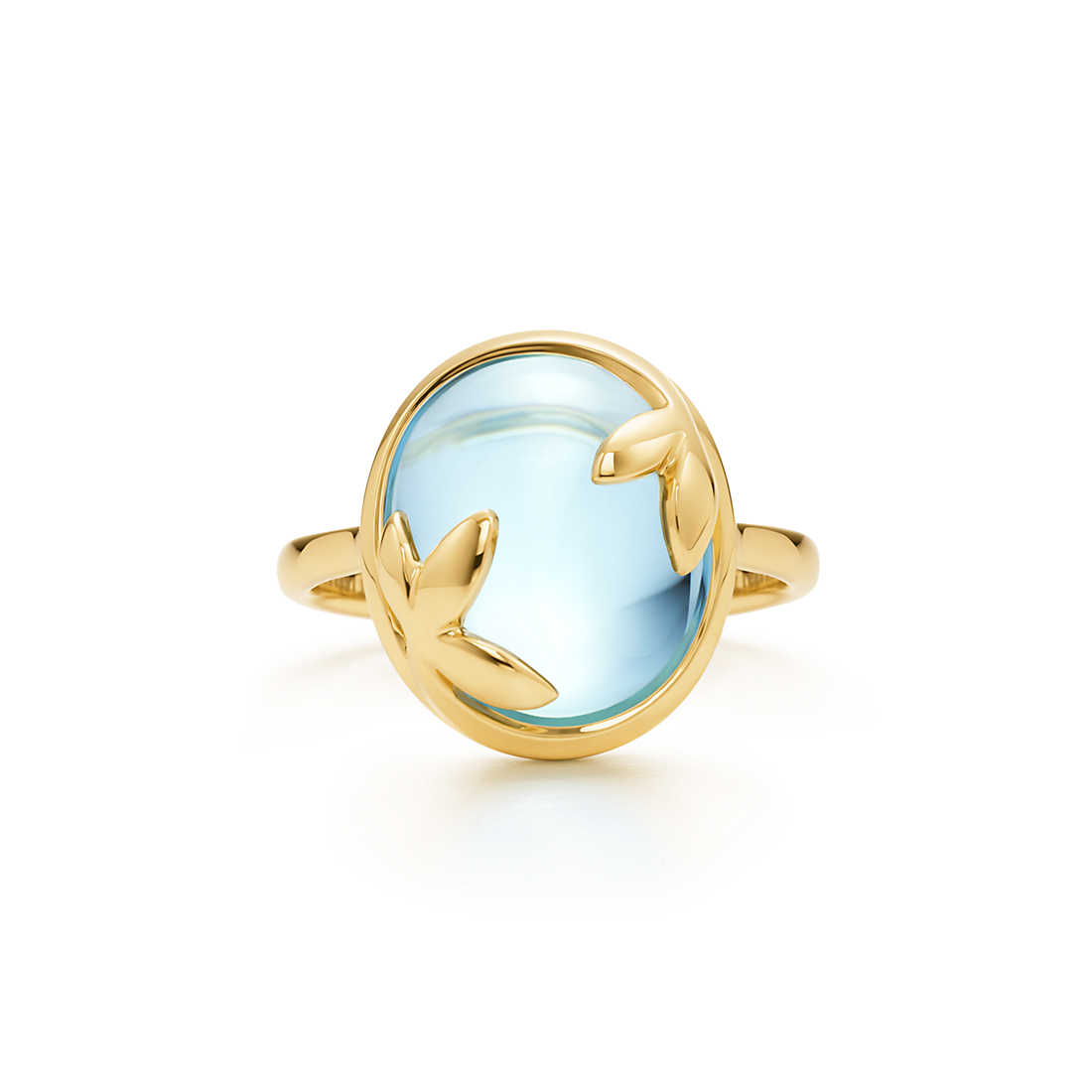 With beautifully sculpted leaves in 18k gold, Paloma honors the olive branch, a symbol of peace and abundance. Ring in 18k gold with blue topaz. Carat weight 6.00. Original designs copyrighted by Paloma Picasso.