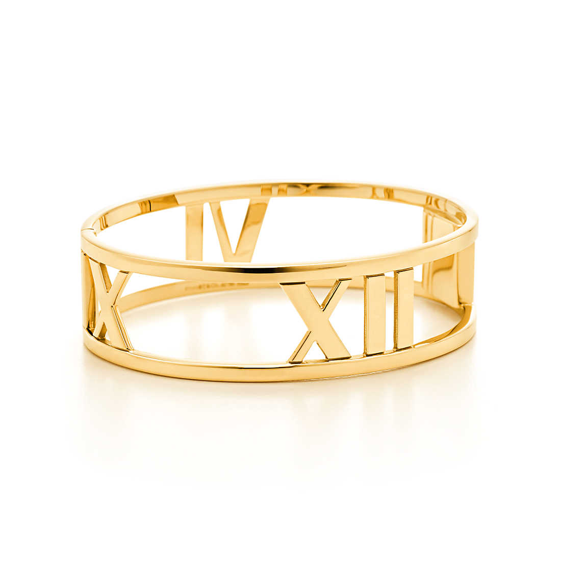 Strong lines meet striking numerals in a contemporary design that honours a Tiffany icon. Hinged bangle in 18k gold. Medium, fits wrists up to 6.25″ in circumference.