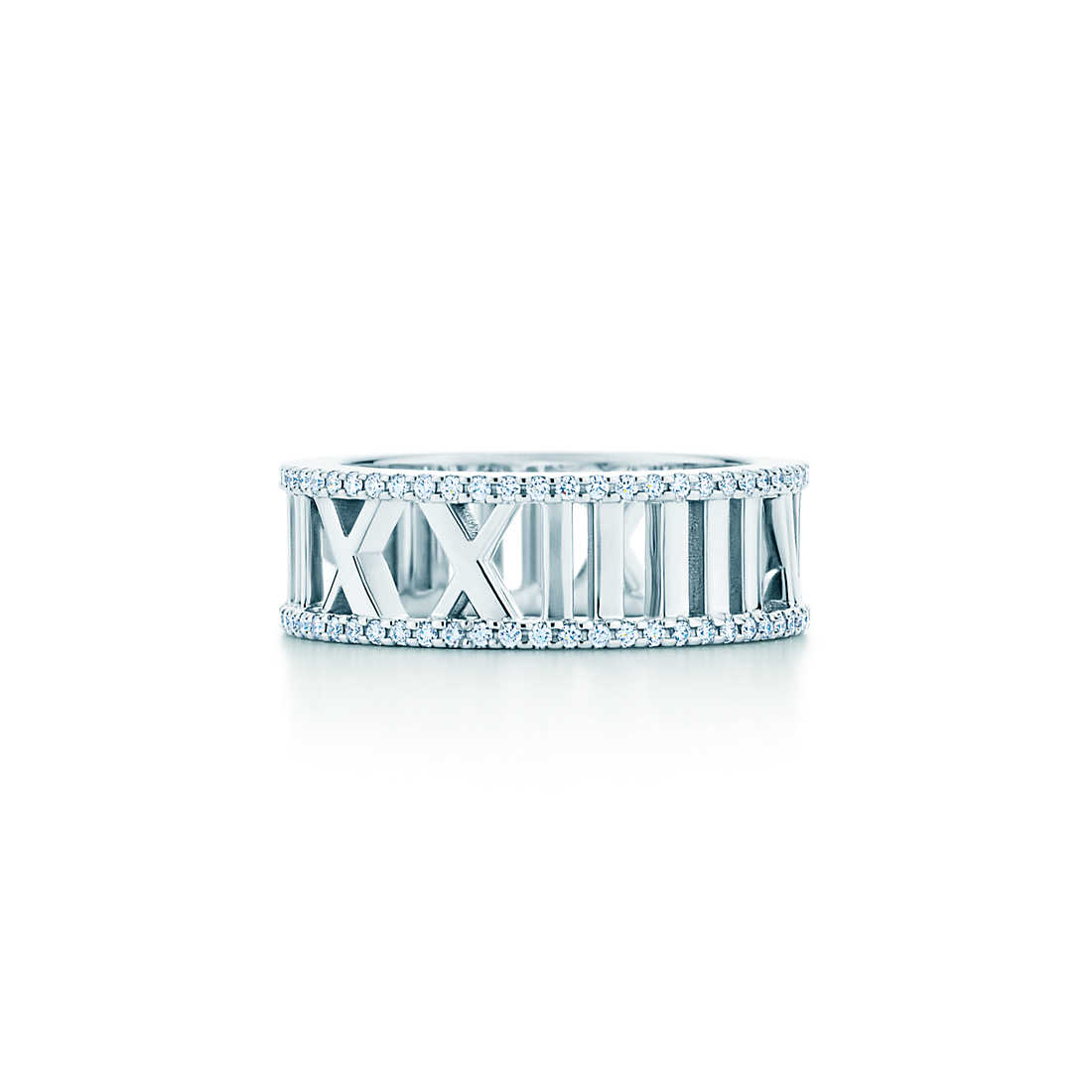 With its bold numeric motif and strong, sleek lines, this collectsion honours one of Tiffany’s most celebrated symbols. Ring in 18k white gold with round brilliant diamonds. Carat total weight .28.